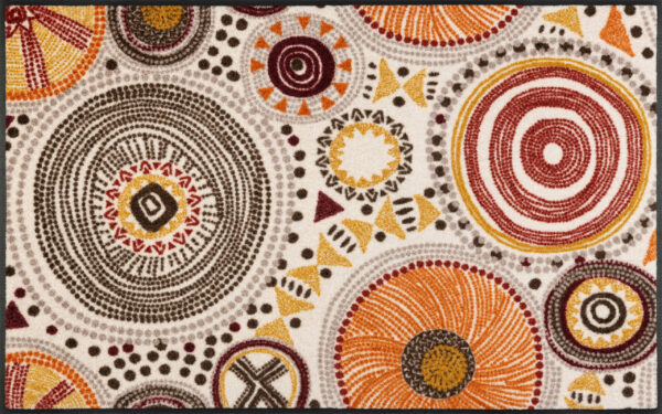 Mata wejściowa Boho Style to wyrazisty i oryginalny dywanik do przedpokoju, który łączy styl etniczny z nowoczesną funkcjonalnością. Wzór oparty na koncentrycznych okręgach, trójkątach i punktach w odcieniach terakoty, przywołuje na myśl rękodzieło inspirowane sztuką ludową. Dzięki temu ten model świetnie wpisuje się w przestrzenie urządzone w stylu boho, etno lub naturalnym.