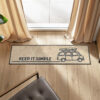 Keep it Simple beige pochodzi z kolekcji Home & Living, serii stworzonej z myślą o wnętrzach, które łączą funkcjonalność z ciepłem domowego klimatu. Motyw busa z deską surfingową i hasłem „KEEP IT SIMPLE” doskonale wpisuje się w styl nadmorski, boho, rustykalny i współczesny minimalistyczny. Naturalna kolorystyka sprawia, że dywanik świetnie współgra z wnętrzami, w których królują jasne barwy i drewniane akcenty.